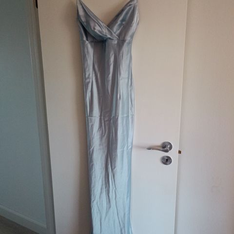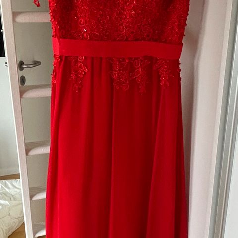 Super smuk galla kjole - kun brugt en gang. Er lidt krøllet eller at have ligget i en kasse, men fantastisk smuk rød farve. Den går kun over den ene skulder og samles med 3 bånd på ryggen. Se også mine andre galla kjoler.