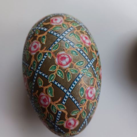 Dette æg kan åbnes i midten og er omkranset med et flot guldindlæg på ydersiden. Trebenet design, hvor benene er ligeledes guldbelagte. Kan bruges som smykkeskrin. Eller de kan bruges som pynt/ påskepynt.