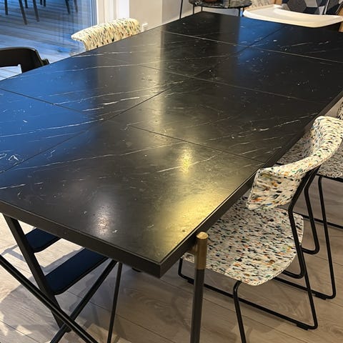 Sælger dette specielle Handvärk spisebord, som ikke findes andre steder. Bordet blev lavet som en demo model hos Handvärk i kun dette ene eksemplar men kom aldrig i produktion pga høje fremstillings omkostninger. Der ligger en massiv træplade i som bordplade fremfor marmor fliserne der normalt ligger i disse borde. Bordpladen er løbende blevet oliebehandlet hver 6. Måned. Meget hårdfør og perfekt til børnefamilier.