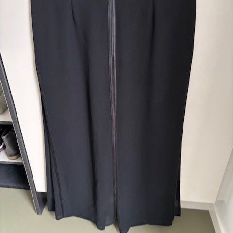 Flot selskabsbuks med kobberfarvet mønster på bærestykket. Der er skjult lynlås på bagsiden. Buksen har været anvendt 1 gang og er helt intakt. Der er vidde i buksen, så den ligner en nederdel, og buksen består af 2 lag stof. Det yderste lag er gennemsigtigt og det inderste lag er ikke gennemsigtigt. Buksen er fremstillet i 100% polyester. Længdemål fra skridt til bund er ca. 75 cm. Buksen kommer fra røgfrit hjem uden husdyr.