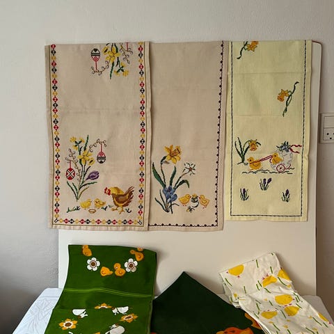 Broderet, Skønneste ca. 80 cm lange broderede påske løber i den dejligste mint grønne farve og med farverige broderede Dalar Haner.