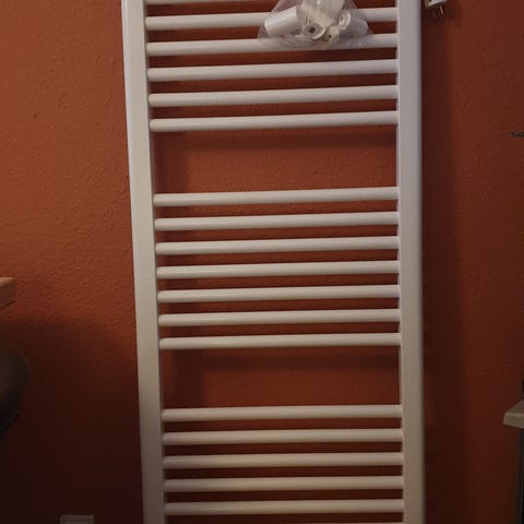 God hvid el radiator til at tørre håndklæder på , der sidder pt et 300 watts elvarme ( 230V ) men det kan let bygges om til centralvarme/fjernvarme Mål er 55 cm bred og 80 cm høj