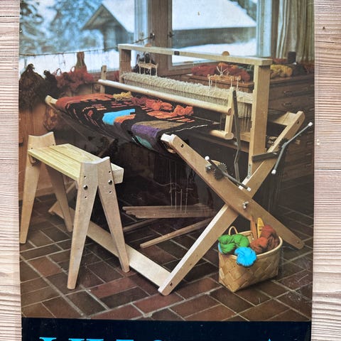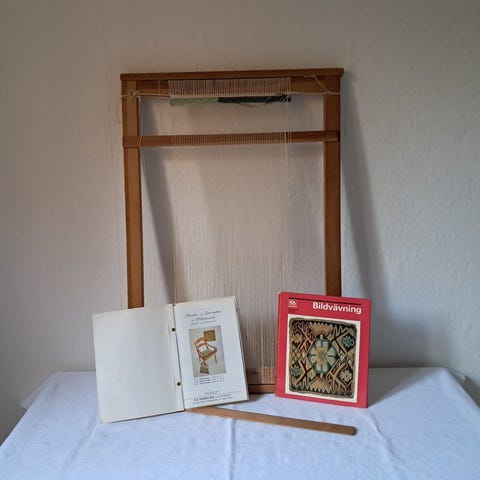 Det ene billede viser det tilbehør, der følger med, blandt andet en vævebog af Paulli Andersen samt en gobelinhammer.