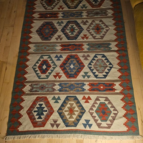 Bemærk at frynserne har varierende længde. Tæppets mål er uden frynserne.
