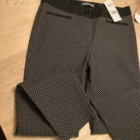 Sorte lange bukser fra Gerry Weber i str 44. Lukkes med en knap og lynlås. 2 lommer foran og 2 lommer bagpå med pynt. Der er bæltestropper. Brugt en del gange men i god stand. Enkelte bittesmå zimilisten er faldet af, men ses ikke.
