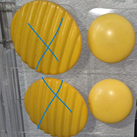 Et par hvide runde, 3 cm i diameter. Plast. Den ene har et lille afslag.
