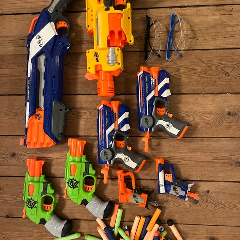 Lille nerf gun med skud - bruger 3 stk AA batterier.
