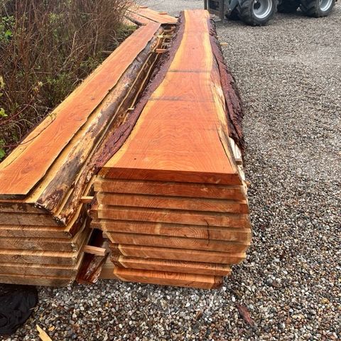 Flotte kraftige planker i lærk, tykkelse 40 mm, bredde ca 30-45 cm, længde 250-300 cm.