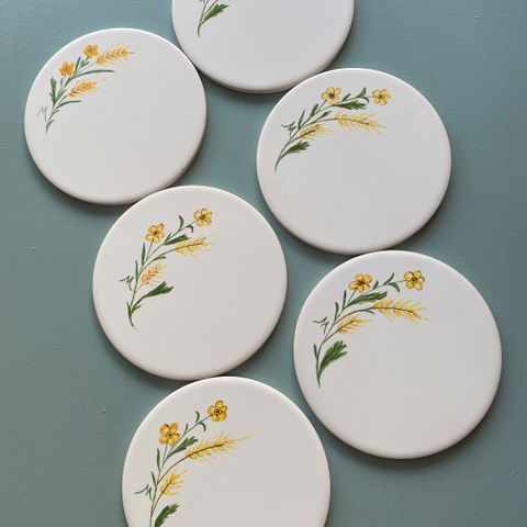 Fine smørebrikker i keramik til at sætte en snor i og hænge op. Perfekt stand. Ø 17 cm. Samlet pris.