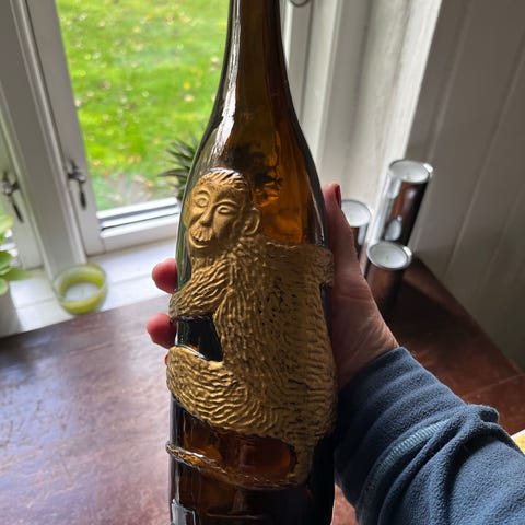 Aben omklamrer flasken og er lagt uden på flasken og aben er forgyldt