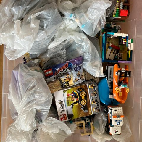 Sælger en større samling blandet LEGO, samlet vægt omkring 35-40 kg. LEGO’en er fordelt i flere kasser, som varierer i vægt – præcise vægte fremgår på labels på kasserne og kan ses på billederne i annoncen.