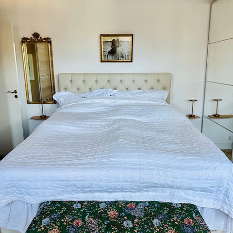 Stort lækkert lysegrå vatteret fløjlsblødt sengetæppe fra Bolia. Skandinavisk design. Bred søm kant som gør den formstabil og let at lægge på sengen. Mål 310 x 310. Passer til en høj seng.