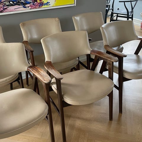 Fire smukke, men slidte spisebordsstole i teak sælges. Erik Kirkegaard model 43. De er klar til ompolstring og nyt betræk. Prisen er pr stol. H:84 x B:62 x D:63 cm. Sæde H:47 x B:52 x D:52 cm.
