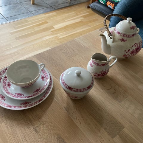 Flot, håndmalet testel, 6 sæt kop og underkop samt flot tekande.