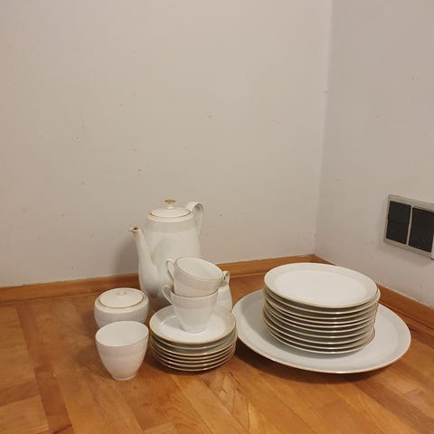 Mål: kop højde 6 cm, dia. 6,5 cm. Underkop dia. 14 cm. Tekande bredde incl. tud og hank 29 cm.