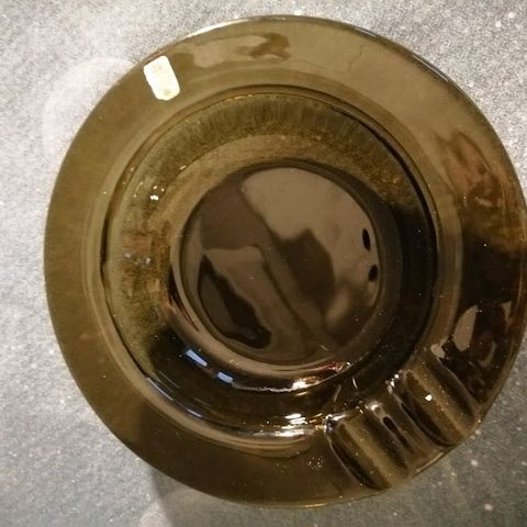 Holmegaard Safirblå askebæger med Ø.K. logo. På udenlandske sites beskrevet som designet af Per Lütken, med navnet 'Atomic Spaceship'