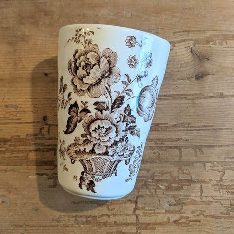 Gammel cremefarvet tandbørsteholder med krog til vaskekluden. Muligvis fra Aluminia, da der er et indpresset A på bagsiden.