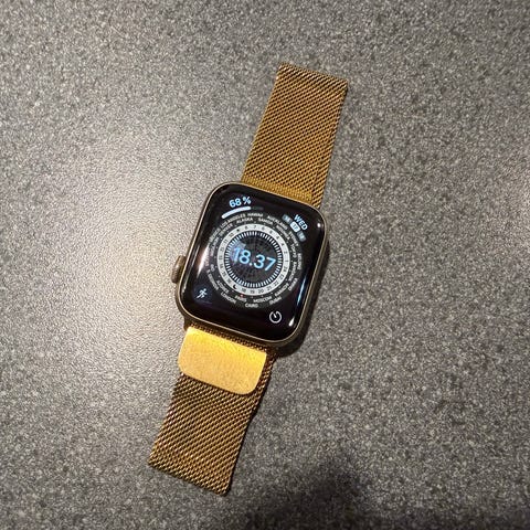 Lækkert Apple watch Series 6 44mm i gold versionen i den eksklusive stål udgave med tilhørende original milanese loop rem.