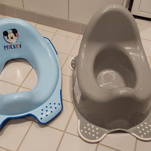 Begge typer produkter er almindelige hjælpemidler, når børn skal lære at smide bleen, hvilket typisk sker i alderen 1,5 til 3 år. (Samlet)