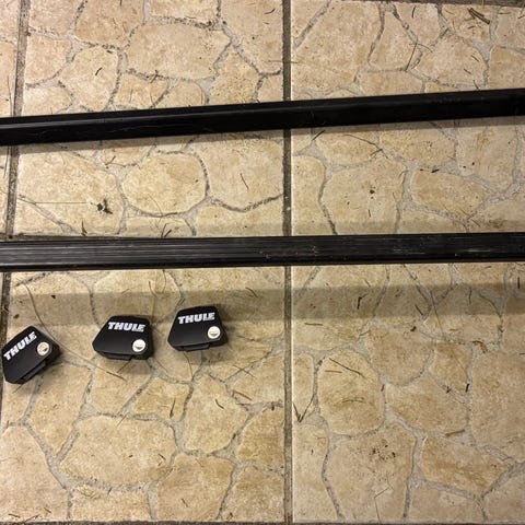 Et sæt fine Thule tagbøjler med låse, nøgler til bolt montering på tag med justere bare beslag, længste ude imellem bolt huller er der 133cm og inde er der 109cm samlet pris 450kr