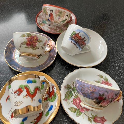 Porcelæn, Mokkakopper, 4 Sæt engelske mokkakopper i hvidt porcelæn med dekorationer og blomster i lyserøde/røde nuancer og tilhørende underkopper.
