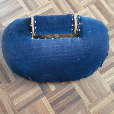 Kniplebræt med valse i rejsestørrelse. Mål ca. 32 cm bred, 28 dyb 15 høj. Brugbar valsebredde ca. 16,5 cm. Meget smukt udført af W. Heise i Nykøbing F. Med lakeret håndtag bagpå, lakerede opstandere og fjerdermekanisme, så valsen kan drejes et lille stykke ad gange. Monteret med prikkebrev til kniplingen "Bertha". Dette kan selvfølgelig let udskiftes. Dejlig blød skumgummi-foring. Meget god stand med kun minimale brugsspor.