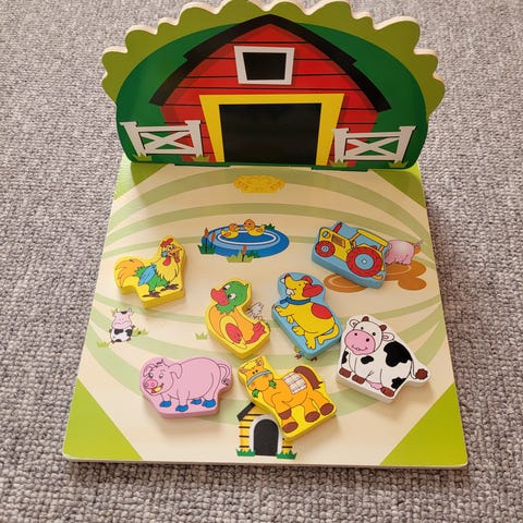 Fine træ knop puslespil med bondegårdsdyr, Noahs Ark og transportmidler.