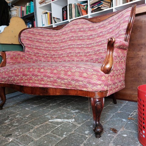 Super skøn lille 2-personers vintage sofa med det fineste mønstrede stof i rosa nuancer. Sofaen er i fin vintage stand med overfladisk tegn på brug dog hverken markante pletter eller huller i betrækket. Er ikke forsøgt renset.
