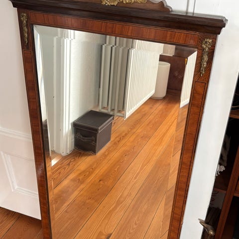 Klassisk ældre stort spejl med flot træramme i afsyret fyrretræ med udskæringer. Højde 160 cm. Bredde 73 cm