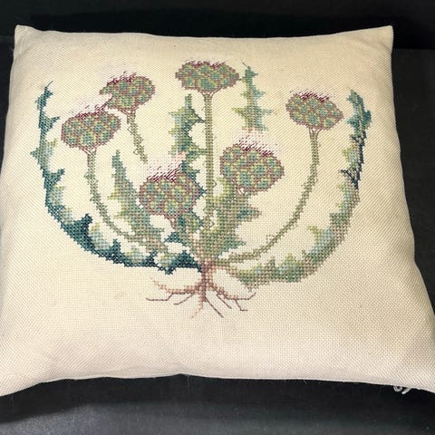 Korsstingbroderi med motiv af Ribisgren med blomster og blade. Puden har " tittekant" af stoffet.