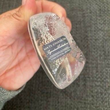 Den smukkeste blå skål, udformet af Mats Jonasson. Den skulle være fra Målerås glasværk, og være fra ‘80’erne. Skålen er ca. 10 cm høj og har en diameter på omkring 19 cm. Der er gods i skålen, som vejer små 1400 gram.