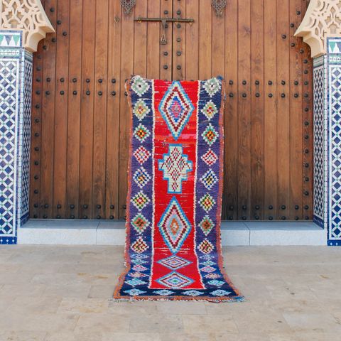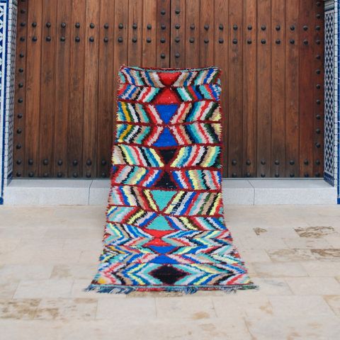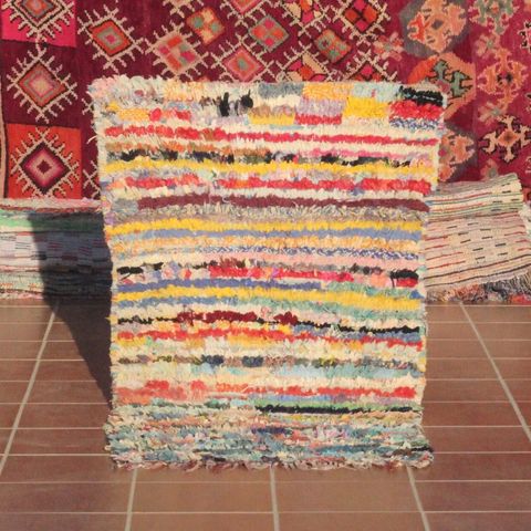 Boucherouite tæpper er lavet af genbrugte tekstiler , hentet fra gamle tøjstykker og stoffer. Væverne skærer forsigtigt disse materialer i strimler og væver dem sammen på en væv, hvilket skaber livlige og abstrakte mønstre. Hvert tæppe er unikt , hvilket afspejler håndværkerens kreativitet og sans for detaljer. De anvendte materialer er både bæredygtige og praktiske, hvilket gør tæpperne til en smuk og funktionel tilføjelse til ethvert hjem.
