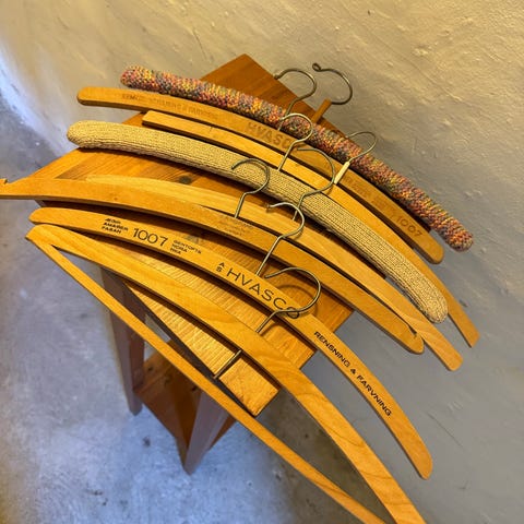 9 bøjler med høj hals på krogen , de er i lakeret bøg(?) og måler 43*24cm