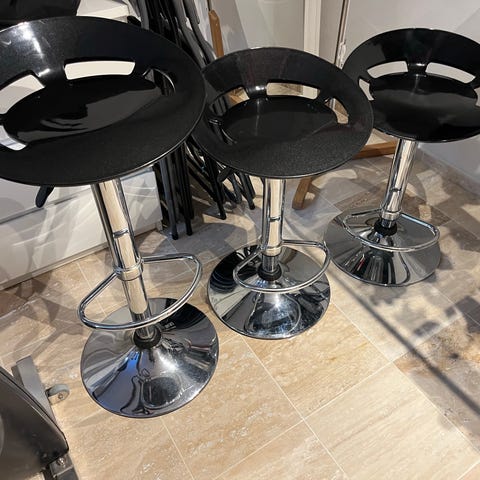 3 stk barstole, sammenklaplige. Sæde og ryglæn i lakeret bøg. Stel i sortlakeret stål med fodstøtte. Sælges samlet