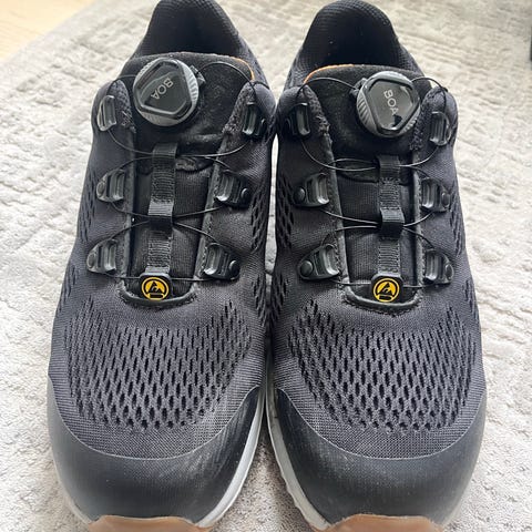 Sikkerhedssko der er brugt en smule, hvilket kan ses på ved fodenden af skoen