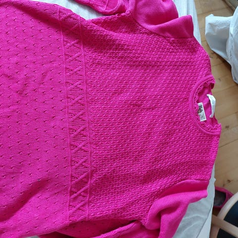 Brystmål 90 cm kan strække sig til ca 100 cm, længde 55 cm ny flot fintstrikket top med perleblomster ved halsen.