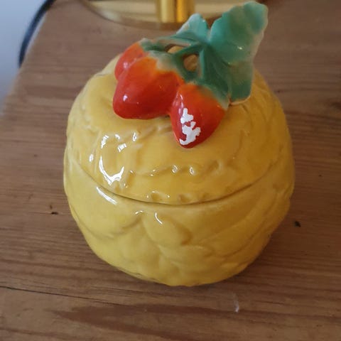 Flot syltetøjskrukke m/låg fra Sorgenfri Keramik - gammel, men i god stand for alder, dog med afslag indvendig på låg. Se sidste billede.