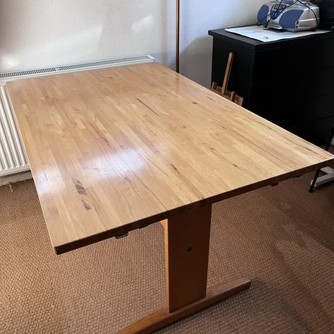 Massiv Bøg skal slibes og olieres, samles med 2 kiler og 4 bolte, kan lige gå ind i st.car