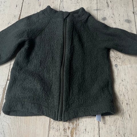 Mørkegrøn uldtrøje med lynlås fra Mikk—Line. Den er brugt men i virkelig god stand. Der er ingen pletter eller hulle og den kommer fra røgfrit og kæledyrsfrit hjem.