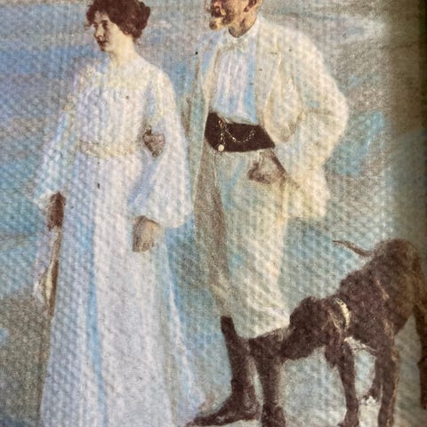 Billede, P.S Krøyer, motiv: Roser, b: 110 h: 90, Idyllisk billede med maleri af skagensmaleren P.S Krøyer. Billedet gengiver værket “Roser” fra 1893. Her har Krøyer malet en have med en blomstrende hvid rosenbusk, i baggrunden ses hans hustru Marie Krøyer siddende i en liggestol med hunden Rap liggende ved sine fødder.