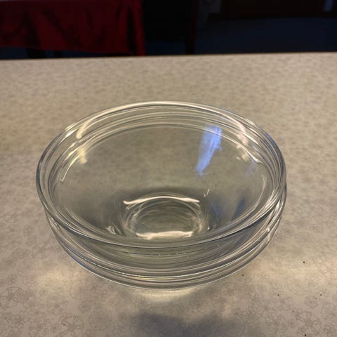 3 stk. serveringsskåle og 6 stk. kage- eller dessert tallerkner i klart presset glas, fra franske Duralex. Alle 9 dele sælges KUN samlet og prisen er for alle 9 dele.