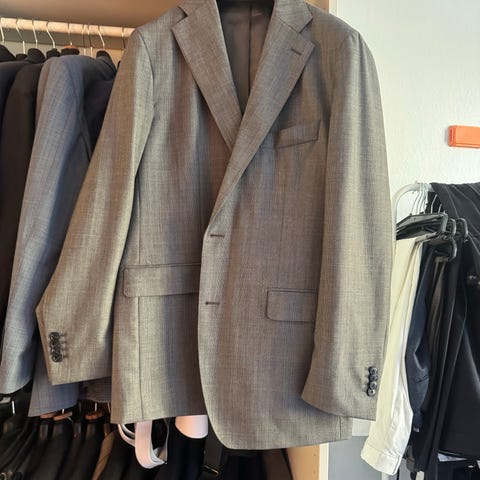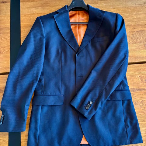 Strellson jakkesæt i gråt med diskret tern. God stand, lille udtræk i stof på bukser ca 2 cm fra lynlås, se foto. Str 102, svarende til large. 100 % viskose.