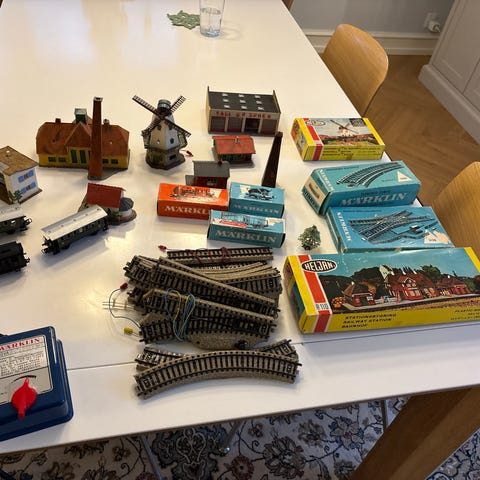 Har også andet mærklin: tog,vogne,transformator og næsten alle slags M-skinner + signaler.