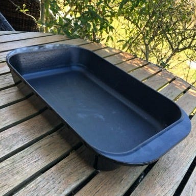 Ovnfast fad i sort støbejern, stemplet France 28. Ca. 28 x 20 cm (m. håndtag: 34 x 20 cm), 5 cm højt/dybt (m. håndtag: 6,5 cm). Har en lang historie, ca. 45 år gammelt, men kun brugt ganske få gange. Er rigtig flot.