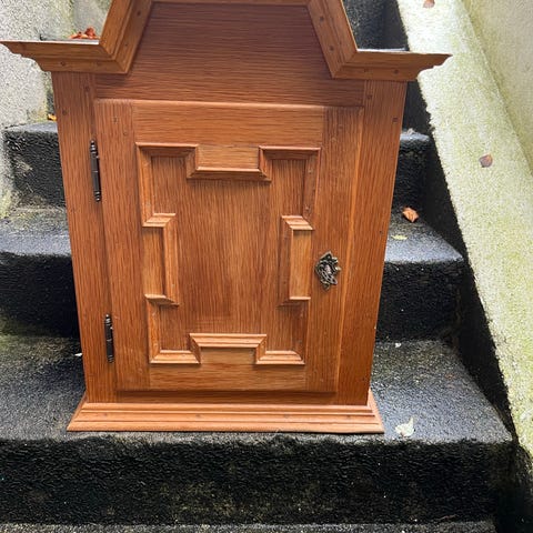 Tobaksskab, b: 62 d: 33 h: 78, Tobaksskab eller vægskab i egetræ, dog med nyere uoriginal bag beklædning. Nøgle mangler.