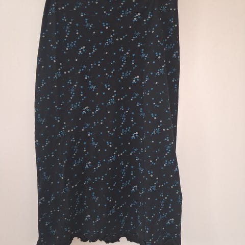 Lys grønt stof med hvide og gule blomster. Angivet str 40-42 / L . Ikke brugt , har ligget i skab derfor krøllet.