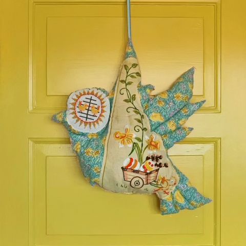 Hæng den på hoveddøren og byd den bæredygtige påske velkommen med en stor fredsdue syet af genbrugstekstil og påskebroderi. Fyld af pladevat. Langt bånd til ophæng. H50 B60 cm. 465 kr.