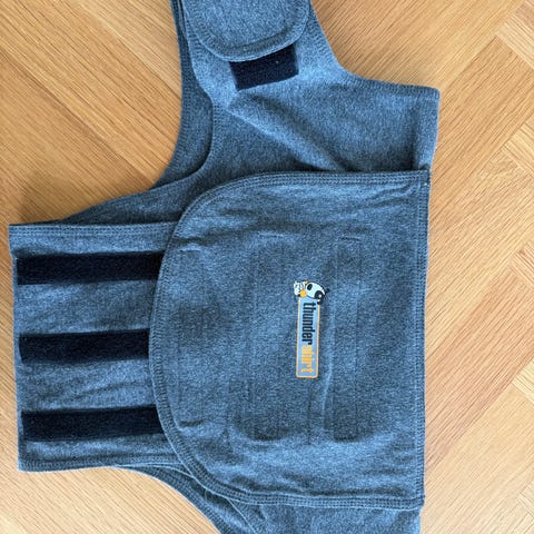 Thundershirt der hjælper med hundeangst. Vi benyttede den til Nytårstræning og et par gange hvor han var med på ferie og skulle være alene hjemme et helt nyt sted