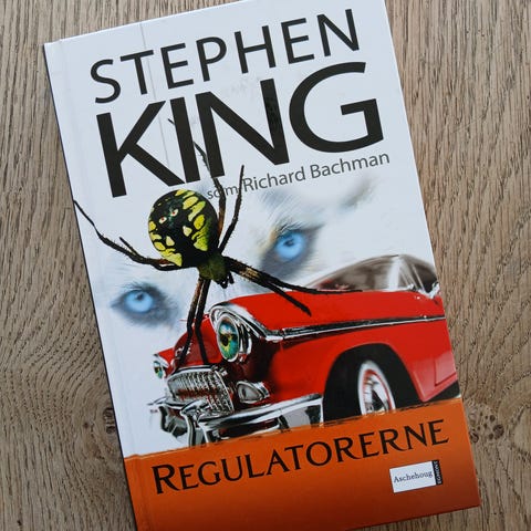 Stephen King Regulatorerne. . bog i hardcover. Denne bog er skrevet under pseudonymet Richard Bachman. Omslaget viser en rød bil og en edderkop. Handlingen foregår i en lille by i Ohio, hvor mystiske begivenheder finder sted. Velegnet til dem, der interesserer sig for spændingsromaner.
