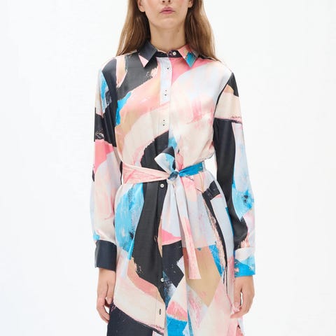 In Wear skjortekjole i str 38 i grafisk print m/klassisk skjortekrave, synlig knaplukning + aftageligt bindebånd.